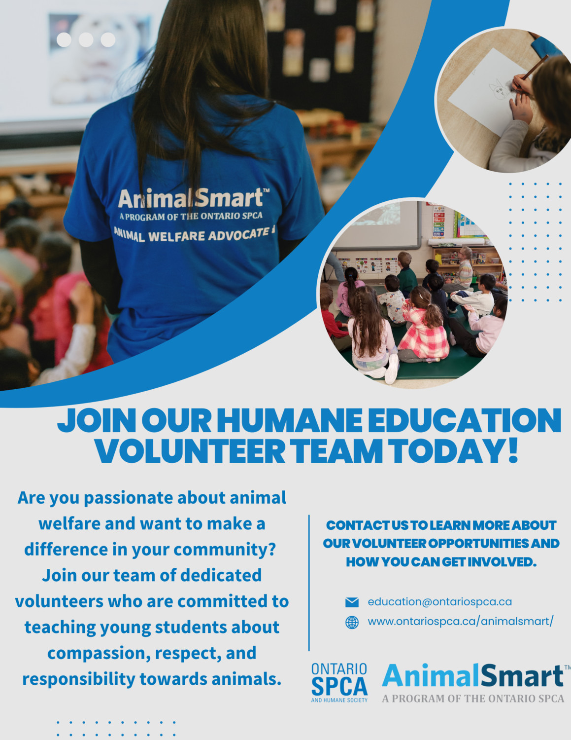 If you enjoy working with children and youth, and have a passion for presenting, we want to hear from you! The Ontario SPCA and Humane Society’s AnimalSmart™ Humane Education program is recruiting volunteers. This is an opportunity to meet like-minded friends while making a direct impact on your local and global community. For more information visit https://ontariospca.ca/animalsmart/