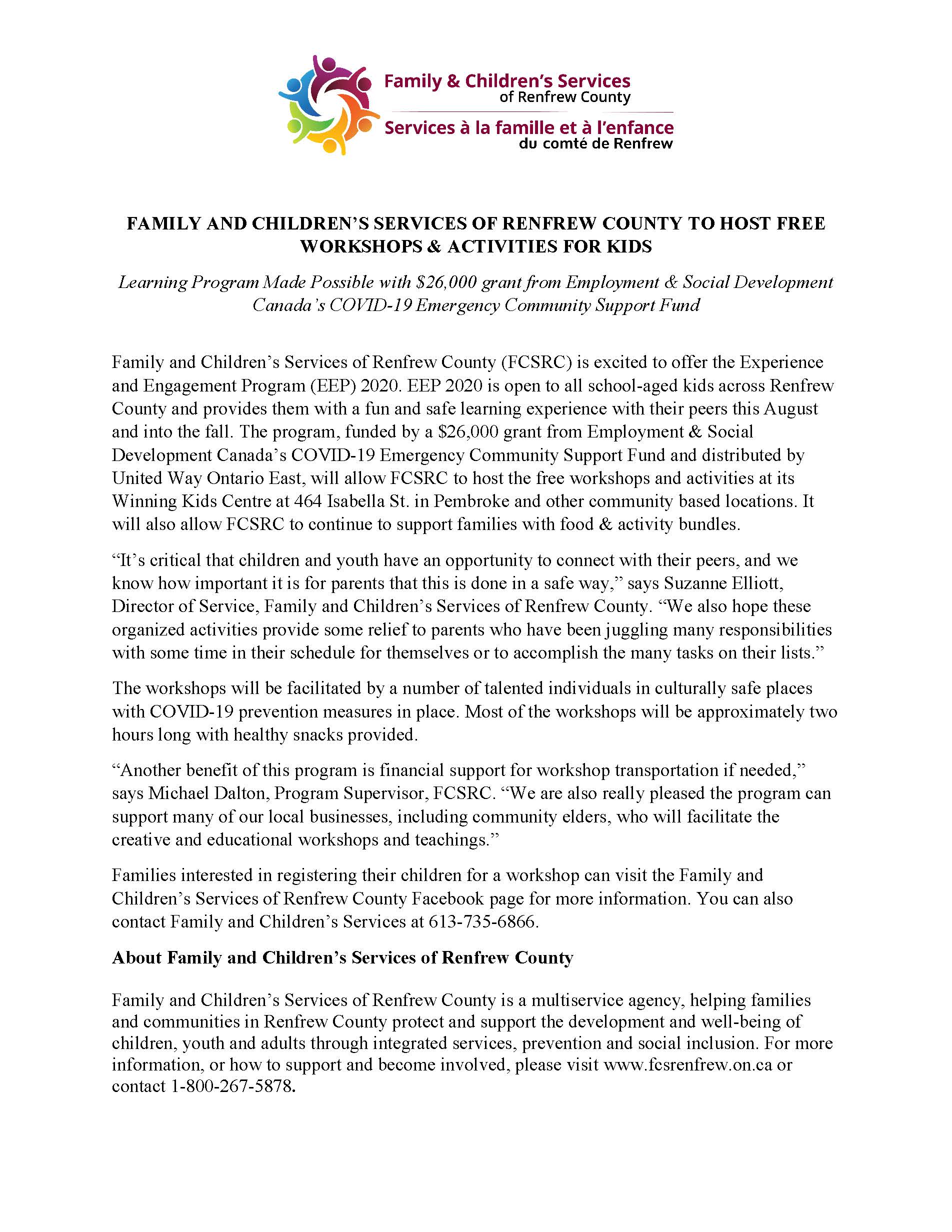 Family & Children Hosting Free Workshops for Renfrew County Kids