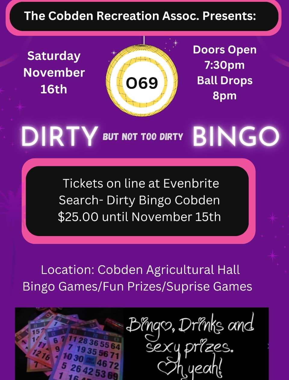 The Cobden Recreation Association Presents Dirty (not to dirty ) Bingo at the Cobden Ag. Hall on Nov 16th Doors open at 7:30 Get your tickets at https://www.eventbrite.ca/e/dirty-but-not-too-dirty-bingo-tickets-1042422081507?aff=ehometext&keep_tld=1