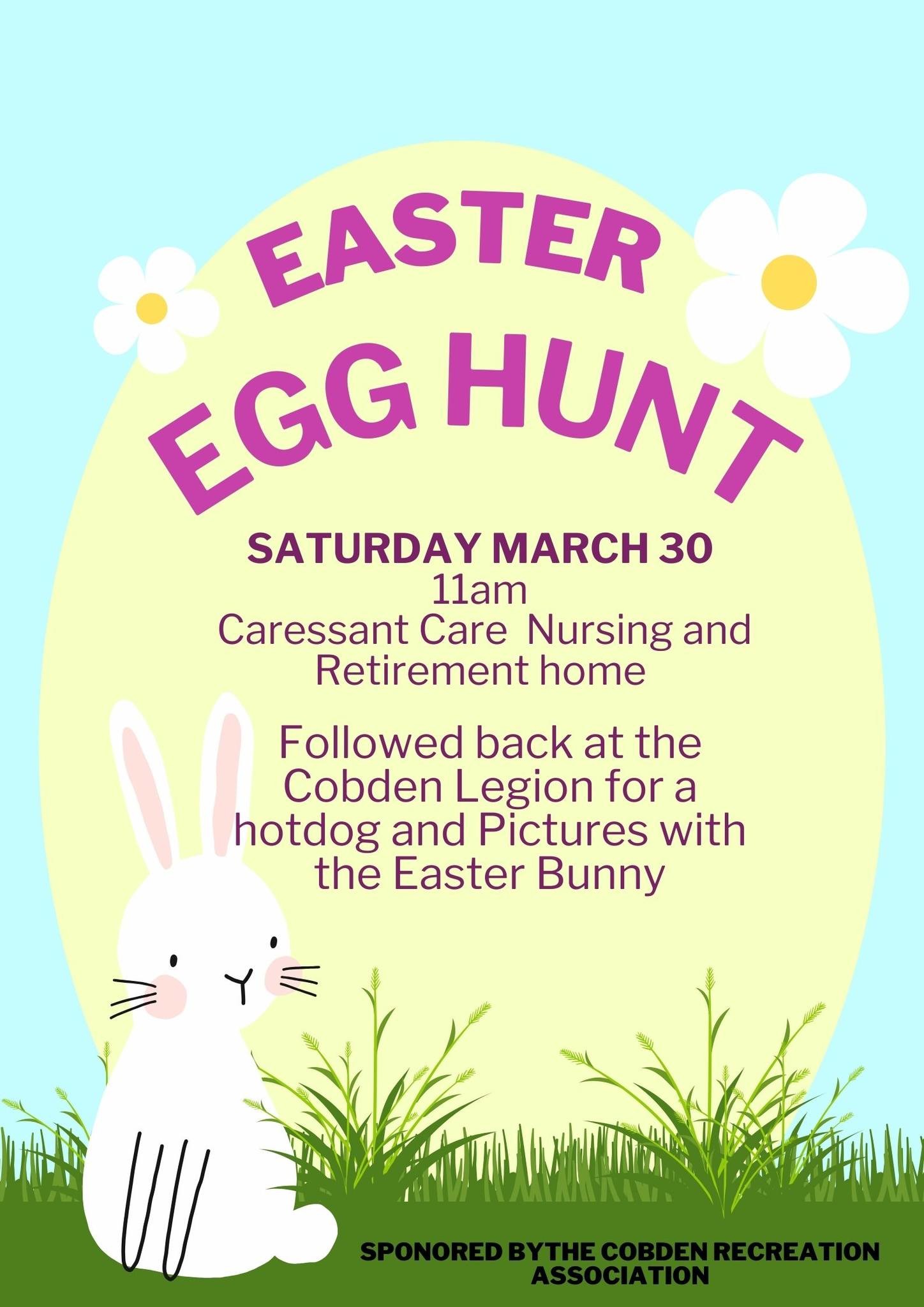 Join the Cobden Rec Association at Caressant Care Nursing and Retirement Home for an Easter Egg Hunt starting at 11:00 am, followed back at the Cobden Legion for a hot dog and Pictures with the Easter Bunny