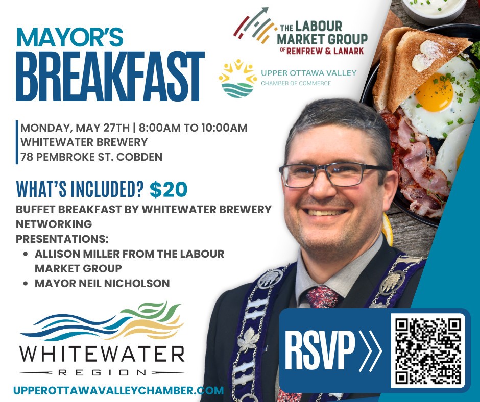 Join us for breakfast with Mayor Neil Nicholson at Whitewater Brewery! Special guest Allison Miller, Labour Market Group of Renfrew & Lanark, will discuss trends in our labour market in time for the summer employment surges. Bring your questions about local economic development and matters that impact our local business community, and enjoy a morning of networking!