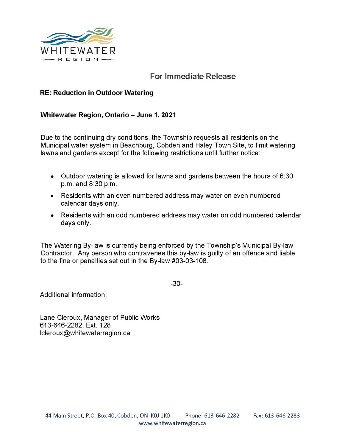 For further inquiries please contact Steve Hodson, Superintendent of Environmental Services 613-646-2282 ext.127 or shodson@whitewaterregion.ca.