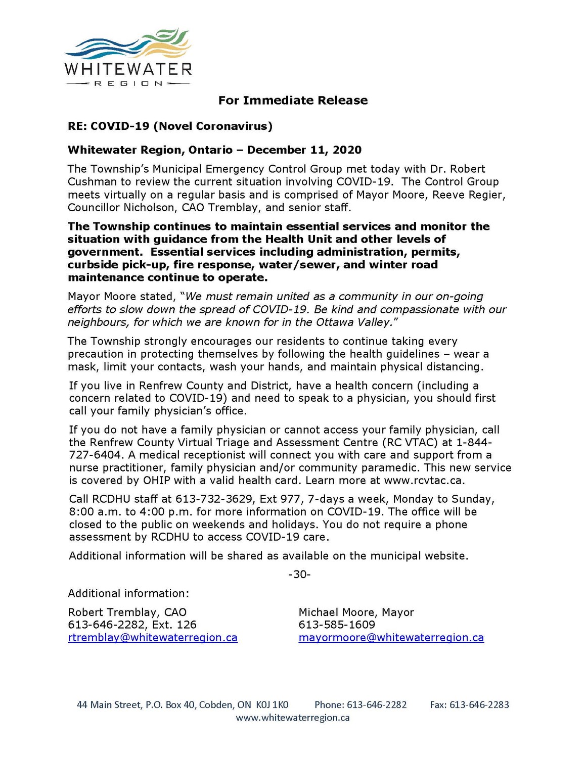 Public Meeting Notice - Zoning By-law Amendment D-14-224Boil Water Advisory LIFTED - Cobden Drinking Water SystemCobden Drinking Water System - Coloured WaterNEWS RELEASE - Wastewater Treatment PlantSouth Ottawa Valley OPP Board SurveyWatermain Flushing in Haley StationHila Road ClosureApril 16, 2025, Watermain Break in BeachburgWatermain Flushing in Cobden April 28 to May 9Watermain Flushing in Beachburg April 15-25February 13th, 2025, Office Closure NoticeFebruary 13th, 2025, Curbside Collection DelayNotice of Online Public Information Centre for Transportation Master PlanService Restored for Village of Cobden after Watermain BreakJanuary 4, 2025 - Beachburg Drinking Water System Boil Water Advisory RescindedJanuary 2, 2024, Beachburg Drinking Water System Boil Water Advisory Remains in Effect Beachburg Drinking Water System Boil Water Advisory News Release - January 2, 2025Boil Water Advisory Frequently Asked Questions (FAQ) January 1, 2025, Boil Water Advisory in the Village of BeachburgWhitewater Region Water and Wastewater Task Force News ReleaseService Disruption NoticeNotice of Watermain Flushing in Cobden Oct. 21st to 25th, 2024Ontario's Seniors Active Living Centre Program News ReleaseRTSF Funding News Release2024 AMO Conference News ReleaseNOTICE TO LANDFILL USERSApril 17, 2024, Regular Council Meeting SummaryApril 3, 2024 Regular Council Meeting SummaryMarch 20, 2024 Regular Council Meeting SummarySolar Eclipse SafetySodium Levels in Haley and Beachburg Municipal Drinking Water SystemsMarch 6, 2024 Regular Council Meeting SummaryFebruary 21, 2024 Regular Council Meeting SummaryFebruary 7, 2024 Regular Council Meeting SummaryRCDHU Announces Opening of Services Hub in Town of RenfrewProposed 2022 Budgets & User FeesCouncil Summary - November 17thCobden and Beachburg Fire Flow Testing - Nov. 15-19, 2021OCWA Cobden Coloured Water IssueCobden Drinking Water System – Coloured WaterRCDHU Pop-up ClinicsRed Cross SurveySpecial Air Quality StatementC222 Notice to Residents - Upcoming Work on Pleasant Valley Steel ArchCOVID-19 All Second Dose Appointments After July 18 Must be Re-scheduledWork Continues on the Algonquin TrailMedia Release - Eligibility for Early Second Dose ExpandsOutdoor Water RestrictionsNews Release - Union Changes May 2021Media Release and Letter of Support Regarding the Eastern Ontario Regional NetworkCulvert ReplacementCOVID-19 Requirements for Seasonal CampgroundsOntario Extending Stay-at-Home Order Until June 2COVID-19 Vaccine Eligibility Expanding to Include New GroupsDraft - Noise BylawDevelopment Charges - Frequently Asked QuestionsCOVID 19 Vaccine Appointment Eligibility Expanding to Include New GroupsMedia Release - EORN Gig ProjectSexual Assault Awareness MonthCOVID-19 News BriefNews Release - Delegated AuthorityNews Release - April 19, 2021 Provincial COVID-19 Stay-At-Home Order & Additional MeasuresCOVID-19 Vaccine Frequently Asked QuestionsCOVID-19 Vaccination Appointments Now Open to Seniors 70 Years of Age and OlderMedia Release - Ontario Government Introduces Province-wide Shutdown Ahead of Easter WeekendProvincial Covid-19 Lockdown and Municipal Services - April 1, 2021Virtual Business Advisory Program Available to Renfrew CountyMedia Release - Vaccine Appointments for Residents 75-79 Years of Age - March 25, 2021MNRF Pembroke Watershed Conditions Statement - Water StudyMedia Advisory - Eastern Ontario Regional Network - Cellular ActivityOntario Supports Tourism, Culture, Sport and Recreation OrganizationsOttawa Power Generation inviting residents along Ottawa and Madawaska River to participate in Town HallCOVID Vaccine Key MessagesVaccine News Brief - March 10, 2021Renfrew County Vaccination Rollout Expands to Next Priority GroupsWDRA Outdoor Rink - Community Rec Grant2021 North & Eastern Ontario Local Food ConferenceRide Share Pilot Project to Launch in Renfrew CountyNotice2021-02-09 News Release - Resumption of Services COVID-19Seniors Community Needs Assessment SurveyNews Release - Age Friendly Community PlanRegional Webinar on Available Financial SupportsNew Funding Available for Hard-Hit Tourism BusinessesNew Release - Small Business Support GrantSale of Industrial Park Lands2021 User Fees and ChargesCounty Trails Prepare for Snowmobile SeasonTownship of Whitewater Region - December 22, 2020 News ReleaseNews Release - Ottawa River Water LevelsNews release COVID-19COVID-19 Test ClinicsWarden Robinson Recognizes Community Champions 2021 Budget - Electronic Public MeetingMuskrat Watershed Council Natural Edge Media Advisory - Accessible Renovation of entrance and ramp by WDRARemembrance Day ClosuresBroomes Creek Dam Review - Notice of Virtual Public Information CentreArena Operations and COVID-19Small Business WeekRenfrew County Starter Company PLUS ProgramRenfrew County Launches New Survey to Establish Community PrioritiesCivitan Donates to Muskrat Lake Boat Launch Repairs Renfrew County COVID-19 briefingMuskrat Boat Launch RepairsCounty on Renfrew Canada Ontario Housing BenefitEmployment Opportunity - Arena AttendantMuskrat Algae BloomWWR Update July 2020Volunteer Award Winners and Bursary RecipientsStage 3 Re-openings in Whitewater RegionDraft Parking By-LawImportant News from Ottawa River Power CorporationMandatory Masks in Enclosed Public SpacesWater AdvisoryCanada & Ontario Support Beef and Hog Farmers During COVID-19COVID-19 Business Assistance FundShop the Valley ContestRegional Relief and Recovery Fund to support Local EconomyFormer Reeve Terry Millar ObituaryWWR Update May 2020Re-openings in Whitewater RegionFarm to Fork Mother's Day DinnerApril 15th - News Release Flood Monitoring PreparationFire Department Public AnnouncementNews Release - County of Renfrew Renfrew County Economic Task Force to Guide COVID-19 Response and RecoveryWatershed Conditions Statement - MNRF - April 7, 2020News Release - Flooding and Resitricted Fire ZoneRestricted Fire Zone Declaration - Natural Resources and Forestry April 1st News Release - Outdoor Recre