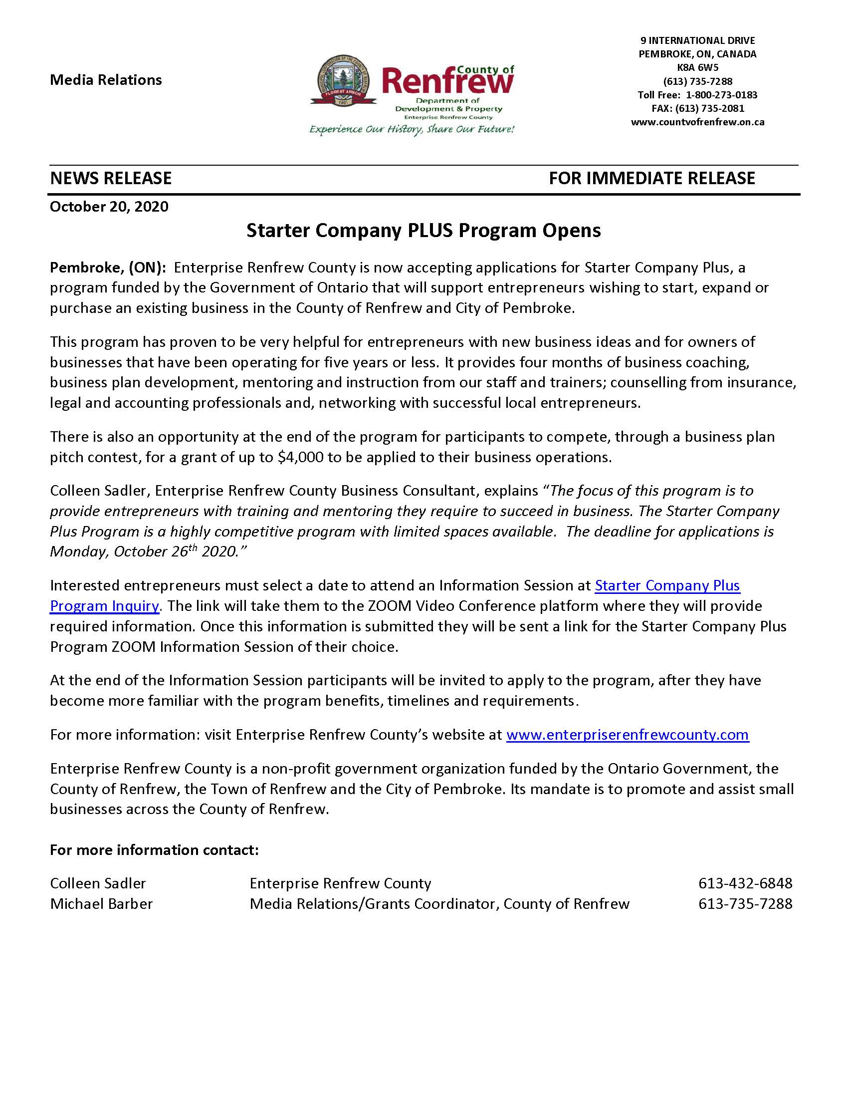 Looking to start, expand or purchase an existing business in the County of Renfrew and City of Pembroke? Enterprise Renfrew County is now accepting applications for Starter Company Plus, a program funded by the Government of Ontario, that will support entrepreneurs