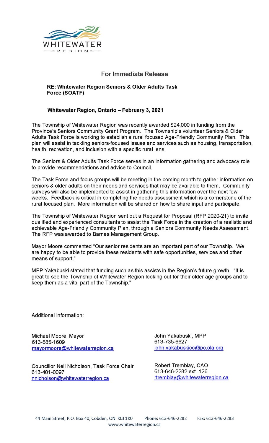 Public Meeting Notice - Zoning By-law Amendment D-14-224Boil Water Advisory LIFTED - Cobden Drinking Water SystemCobden Drinking Water System - Coloured WaterNEWS RELEASE - Wastewater Treatment PlantSouth Ottawa Valley OPP Board SurveyWatermain Flushing in Haley StationHila Road ClosureApril 16, 2025, Watermain Break in BeachburgWatermain Flushing in Cobden April 28 to May 9Watermain Flushing in Beachburg April 15-25February 13th, 2025, Office Closure NoticeFebruary 13th, 2025, Curbside Collection DelayNotice of Online Public Information Centre for Transportation Master PlanService Restored for Village of Cobden after Watermain BreakJanuary 4, 2025 - Beachburg Drinking Water System Boil Water Advisory RescindedJanuary 2, 2024, Beachburg Drinking Water System Boil Water Advisory Remains in Effect Beachburg Drinking Water System Boil Water Advisory News Release - January 2, 2025Boil Water Advisory Frequently Asked Questions (FAQ) January 1, 2025, Boil Water Advisory in the Village of BeachburgWhitewater Region Water and Wastewater Task Force News ReleaseService Disruption NoticeNotice of Watermain Flushing in Cobden Oct. 21st to 25th, 2024Ontario's Seniors Active Living Centre Program News ReleaseRTSF Funding News Release2024 AMO Conference News ReleaseNOTICE TO LANDFILL USERSApril 17, 2024, Regular Council Meeting SummaryApril 3, 2024 Regular Council Meeting SummaryMarch 20, 2024 Regular Council Meeting SummarySolar Eclipse SafetySodium Levels in Haley and Beachburg Municipal Drinking Water SystemsMarch 6, 2024 Regular Council Meeting SummaryFebruary 21, 2024 Regular Council Meeting SummaryFebruary 7, 2024 Regular Council Meeting SummaryRCDHU Announces Opening of Services Hub in Town of RenfrewProposed 2022 Budgets & User FeesCouncil Summary - November 17thCobden and Beachburg Fire Flow Testing - Nov. 15-19, 2021OCWA Cobden Coloured Water IssueCobden Drinking Water System – Coloured WaterRCDHU Pop-up ClinicsRed Cross SurveySpecial Air Quality StatementC222 Notice to Residents - Upcoming Work on Pleasant Valley Steel ArchCOVID-19 All Second Dose Appointments After July 18 Must be Re-scheduledWork Continues on the Algonquin TrailMedia Release - Eligibility for Early Second Dose ExpandsOutdoor Water RestrictionsNews Release - Union Changes May 2021Media Release and Letter of Support Regarding the Eastern Ontario Regional NetworkCulvert ReplacementCOVID-19 Requirements for Seasonal CampgroundsOntario Extending Stay-at-Home Order Until June 2COVID-19 Vaccine Eligibility Expanding to Include New GroupsDraft - Noise BylawDevelopment Charges - Frequently Asked QuestionsCOVID 19 Vaccine Appointment Eligibility Expanding to Include New GroupsMedia Release - EORN Gig ProjectSexual Assault Awareness MonthCOVID-19 News BriefNews Release - Delegated AuthorityNews Release - April 19, 2021 Provincial COVID-19 Stay-At-Home Order & Additional MeasuresCOVID-19 Vaccine Frequently Asked QuestionsCOVID-19 Vaccination Appointments Now Open to Seniors 70 Years of Age and OlderMedia Release - Ontario Government Introduces Province-wide Shutdown Ahead of Easter WeekendProvincial Covid-19 Lockdown and Municipal Services - April 1, 2021Virtual Business Advisory Program Available to Renfrew CountyMedia Release - Vaccine Appointments for Residents 75-79 Years of Age - March 25, 2021MNRF Pembroke Watershed Conditions Statement - Water StudyMedia Advisory - Eastern Ontario Regional Network - Cellular ActivityOntario Supports Tourism, Culture, Sport and Recreation OrganizationsOttawa Power Generation inviting residents along Ottawa and Madawaska River to participate in Town HallCOVID Vaccine Key MessagesVaccine News Brief - March 10, 2021Renfrew County Vaccination Rollout Expands to Next Priority GroupsWDRA Outdoor Rink - Community Rec Grant2021 North & Eastern Ontario Local Food ConferenceRide Share Pilot Project to Launch in Renfrew CountyNotice2021-02-09 News Release - Resumption of Services COVID-19Seniors Community Needs Assessment SurveyNews Release - Age Friendly Community PlanRegional Webinar on Available Financial SupportsNew Funding Available for Hard-Hit Tourism BusinessesNew Release - Small Business Support GrantSale of Industrial Park Lands2021 User Fees and ChargesCounty Trails Prepare for Snowmobile SeasonTownship of Whitewater Region - December 22, 2020 News ReleaseNews Release - Ottawa River Water LevelsNews release COVID-19COVID-19 Test ClinicsWarden Robinson Recognizes Community Champions 2021 Budget - Electronic Public MeetingMuskrat Watershed Council Natural Edge Media Advisory - Accessible Renovation of entrance and ramp by WDRARemembrance Day ClosuresBroomes Creek Dam Review - Notice of Virtual Public Information CentreArena Operations and COVID-19Small Business WeekRenfrew County Starter Company PLUS ProgramRenfrew County Launches New Survey to Establish Community PrioritiesCivitan Donates to Muskrat Lake Boat Launch Repairs Renfrew County COVID-19 briefingMuskrat Boat Launch RepairsCounty on Renfrew Canada Ontario Housing BenefitEmployment Opportunity - Arena AttendantMuskrat Algae BloomWWR Update July 2020Volunteer Award Winners and Bursary RecipientsStage 3 Re-openings in Whitewater RegionDraft Parking By-LawImportant News from Ottawa River Power CorporationMandatory Masks in Enclosed Public SpacesWater AdvisoryCanada & Ontario Support Beef and Hog Farmers During COVID-19COVID-19 Business Assistance FundShop the Valley ContestRegional Relief and Recovery Fund to support Local EconomyFormer Reeve Terry Millar ObituaryWWR Update May 2020Re-openings in Whitewater RegionFarm to Fork Mother's Day DinnerApril 15th - News Release Flood Monitoring PreparationFire Department Public AnnouncementNews Release - County of Renfrew Renfrew County Economic Task Force to Guide COVID-19 Response and RecoveryWatershed Conditions Statement - MNRF - April 7, 2020News Release - Flooding and Resitricted Fire ZoneRestricted Fire Zone Declaration - Natural Resources and Forestry April 1st News Release - Outdoor Recre