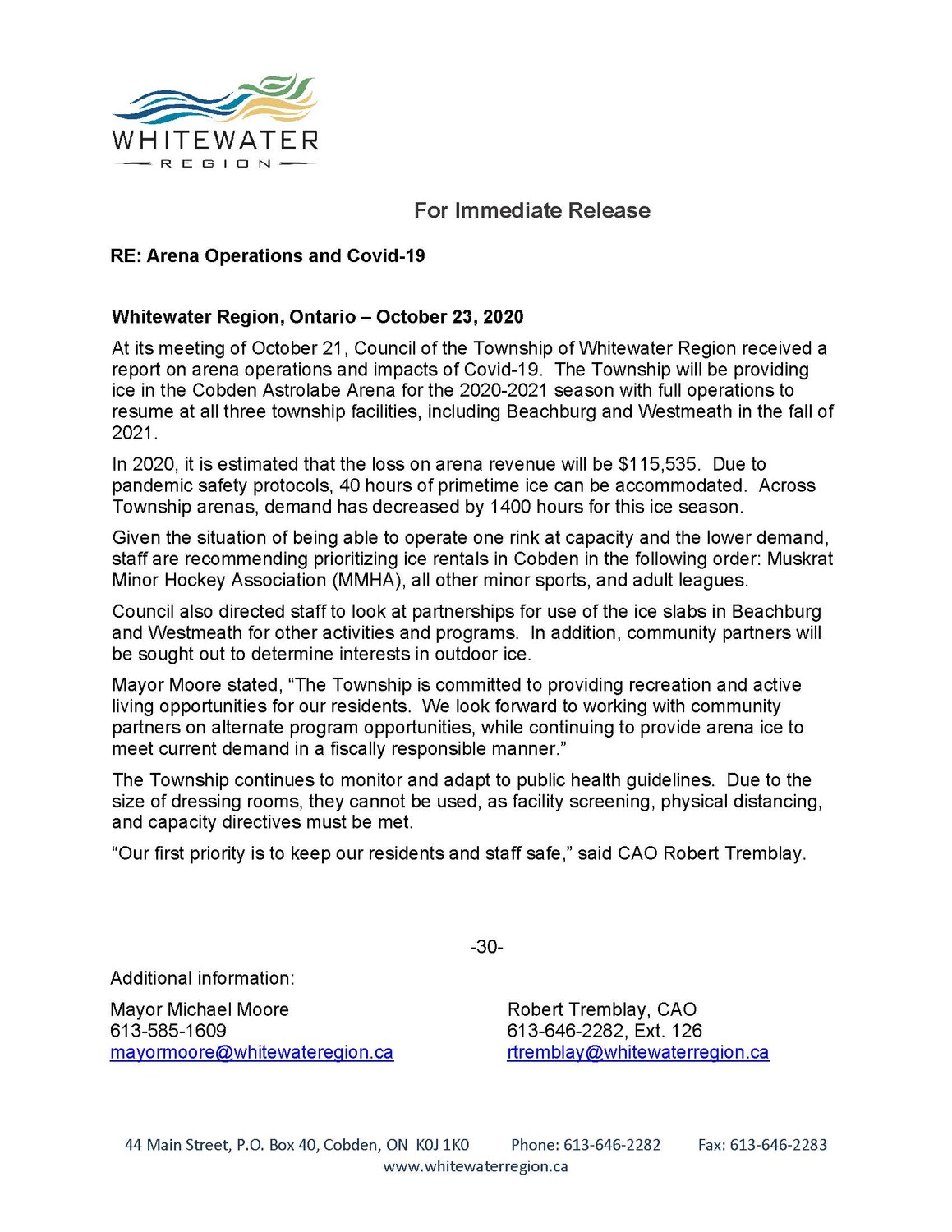 Public Meeting Notice - Zoning By-law Amendment D-14-224Boil Water Advisory LIFTED - Cobden Drinking Water SystemCobden Drinking Water System - Coloured WaterNEWS RELEASE - Wastewater Treatment PlantSouth Ottawa Valley OPP Board SurveyWatermain Flushing in Haley StationHila Road ClosureApril 16, 2025, Watermain Break in BeachburgWatermain Flushing in Cobden April 28 to May 9Watermain Flushing in Beachburg April 15-25February 13th, 2025, Office Closure NoticeFebruary 13th, 2025, Curbside Collection DelayNotice of Online Public Information Centre for Transportation Master PlanService Restored for Village of Cobden after Watermain BreakJanuary 4, 2025 - Beachburg Drinking Water System Boil Water Advisory RescindedJanuary 2, 2024, Beachburg Drinking Water System Boil Water Advisory Remains in Effect Beachburg Drinking Water System Boil Water Advisory News Release - January 2, 2025Boil Water Advisory Frequently Asked Questions (FAQ) January 1, 2025, Boil Water Advisory in the Village of BeachburgWhitewater Region Water and Wastewater Task Force News ReleaseService Disruption NoticeNotice of Watermain Flushing in Cobden Oct. 21st to 25th, 2024Ontario's Seniors Active Living Centre Program News ReleaseRTSF Funding News Release2024 AMO Conference News ReleaseNOTICE TO LANDFILL USERSApril 17, 2024, Regular Council Meeting SummaryApril 3, 2024 Regular Council Meeting SummaryMarch 20, 2024 Regular Council Meeting SummarySolar Eclipse SafetySodium Levels in Haley and Beachburg Municipal Drinking Water SystemsMarch 6, 2024 Regular Council Meeting SummaryFebruary 21, 2024 Regular Council Meeting SummaryFebruary 7, 2024 Regular Council Meeting SummaryRCDHU Announces Opening of Services Hub in Town of RenfrewProposed 2022 Budgets & User FeesCouncil Summary - November 17thCobden and Beachburg Fire Flow Testing - Nov. 15-19, 2021OCWA Cobden Coloured Water IssueCobden Drinking Water System – Coloured WaterRCDHU Pop-up ClinicsRed Cross SurveySpecial Air Quality StatementC222 Notice to Residents - Upcoming Work on Pleasant Valley Steel ArchCOVID-19 All Second Dose Appointments After July 18 Must be Re-scheduledWork Continues on the Algonquin TrailMedia Release - Eligibility for Early Second Dose ExpandsOutdoor Water RestrictionsNews Release - Union Changes May 2021Media Release and Letter of Support Regarding the Eastern Ontario Regional NetworkCulvert ReplacementCOVID-19 Requirements for Seasonal CampgroundsOntario Extending Stay-at-Home Order Until June 2COVID-19 Vaccine Eligibility Expanding to Include New GroupsDraft - Noise BylawDevelopment Charges - Frequently Asked QuestionsCOVID 19 Vaccine Appointment Eligibility Expanding to Include New GroupsMedia Release - EORN Gig ProjectSexual Assault Awareness MonthCOVID-19 News BriefNews Release - Delegated AuthorityNews Release - April 19, 2021 Provincial COVID-19 Stay-At-Home Order & Additional MeasuresCOVID-19 Vaccine Frequently Asked QuestionsCOVID-19 Vaccination Appointments Now Open to Seniors 70 Years of Age and OlderMedia Release - Ontario Government Introduces Province-wide Shutdown Ahead of Easter WeekendProvincial Covid-19 Lockdown and Municipal Services - April 1, 2021Virtual Business Advisory Program Available to Renfrew CountyMedia Release - Vaccine Appointments for Residents 75-79 Years of Age - March 25, 2021MNRF Pembroke Watershed Conditions Statement - Water StudyMedia Advisory - Eastern Ontario Regional Network - Cellular ActivityOntario Supports Tourism, Culture, Sport and Recreation OrganizationsOttawa Power Generation inviting residents along Ottawa and Madawaska River to participate in Town HallCOVID Vaccine Key MessagesVaccine News Brief - March 10, 2021Renfrew County Vaccination Rollout Expands to Next Priority GroupsWDRA Outdoor Rink - Community Rec Grant2021 North & Eastern Ontario Local Food ConferenceRide Share Pilot Project to Launch in Renfrew CountyNotice2021-02-09 News Release - Resumption of Services COVID-19Seniors Community Needs Assessment SurveyNews Release - Age Friendly Community PlanRegional Webinar on Available Financial SupportsNew Funding Available for Hard-Hit Tourism BusinessesNew Release - Small Business Support GrantSale of Industrial Park Lands2021 User Fees and ChargesCounty Trails Prepare for Snowmobile SeasonTownship of Whitewater Region - December 22, 2020 News ReleaseNews Release - Ottawa River Water LevelsNews release COVID-19COVID-19 Test ClinicsWarden Robinson Recognizes Community Champions 2021 Budget - Electronic Public MeetingMuskrat Watershed Council Natural Edge Media Advisory - Accessible Renovation of entrance and ramp by WDRARemembrance Day ClosuresBroomes Creek Dam Review - Notice of Virtual Public Information CentreArena Operations and COVID-19Small Business WeekRenfrew County Starter Company PLUS ProgramRenfrew County Launches New Survey to Establish Community PrioritiesCivitan Donates to Muskrat Lake Boat Launch Repairs Renfrew County COVID-19 briefingMuskrat Boat Launch RepairsCounty on Renfrew Canada Ontario Housing BenefitEmployment Opportunity - Arena AttendantMuskrat Algae BloomWWR Update July 2020Volunteer Award Winners and Bursary RecipientsStage 3 Re-openings in Whitewater RegionDraft Parking By-LawImportant News from Ottawa River Power CorporationMandatory Masks in Enclosed Public SpacesWater AdvisoryCanada & Ontario Support Beef and Hog Farmers During COVID-19COVID-19 Business Assistance FundShop the Valley ContestRegional Relief and Recovery Fund to support Local EconomyFormer Reeve Terry Millar ObituaryWWR Update May 2020Re-openings in Whitewater RegionFarm to Fork Mother's Day DinnerApril 15th - News Release Flood Monitoring PreparationFire Department Public AnnouncementNews Release - County of Renfrew Renfrew County Economic Task Force to Guide COVID-19 Response and RecoveryWatershed Conditions Statement - MNRF - April 7, 2020News Release - Flooding and Resitricted Fire ZoneRestricted Fire Zone Declaration - Natural Resources and Forestry April 1st News Release - Outdoor Recre