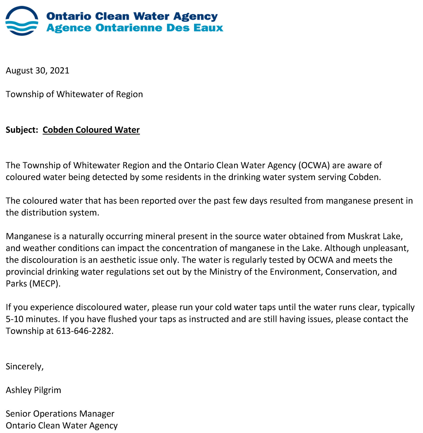 OCWA Cobden Coloured Water Issue