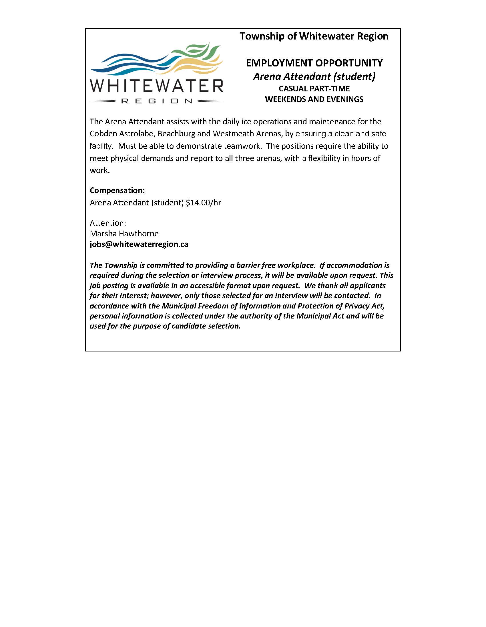 Public Meeting Notice - Zoning By-law Amendment D-14-224Boil Water Advisory LIFTED - Cobden Drinking Water SystemCobden Drinking Water System - Coloured WaterNEWS RELEASE - Wastewater Treatment PlantSouth Ottawa Valley OPP Board SurveyWatermain Flushing in Haley StationHila Road ClosureApril 16, 2025, Watermain Break in BeachburgWatermain Flushing in Cobden April 28 to May 9Watermain Flushing in Beachburg April 15-25February 13th, 2025, Office Closure NoticeFebruary 13th, 2025, Curbside Collection DelayNotice of Online Public Information Centre for Transportation Master PlanService Restored for Village of Cobden after Watermain BreakJanuary 4, 2025 - Beachburg Drinking Water System Boil Water Advisory RescindedJanuary 2, 2024, Beachburg Drinking Water System Boil Water Advisory Remains in Effect Beachburg Drinking Water System Boil Water Advisory News Release - January 2, 2025Boil Water Advisory Frequently Asked Questions (FAQ) January 1, 2025, Boil Water Advisory in the Village of BeachburgWhitewater Region Water and Wastewater Task Force News ReleaseService Disruption NoticeNotice of Watermain Flushing in Cobden Oct. 21st to 25th, 2024Ontario's Seniors Active Living Centre Program News ReleaseRTSF Funding News Release2024 AMO Conference News ReleaseNOTICE TO LANDFILL USERSApril 17, 2024, Regular Council Meeting SummaryApril 3, 2024 Regular Council Meeting SummaryMarch 20, 2024 Regular Council Meeting SummarySolar Eclipse SafetySodium Levels in Haley and Beachburg Municipal Drinking Water SystemsMarch 6, 2024 Regular Council Meeting SummaryFebruary 21, 2024 Regular Council Meeting SummaryFebruary 7, 2024 Regular Council Meeting SummaryRCDHU Announces Opening of Services Hub in Town of RenfrewProposed 2022 Budgets & User FeesCouncil Summary - November 17thCobden and Beachburg Fire Flow Testing - Nov. 15-19, 2021OCWA Cobden Coloured Water IssueCobden Drinking Water System – Coloured WaterRCDHU Pop-up ClinicsRed Cross SurveySpecial Air Quality StatementC222 Notice to Residents - Upcoming Work on Pleasant Valley Steel ArchCOVID-19 All Second Dose Appointments After July 18 Must be Re-scheduledWork Continues on the Algonquin TrailMedia Release - Eligibility for Early Second Dose ExpandsOutdoor Water RestrictionsNews Release - Union Changes May 2021Media Release and Letter of Support Regarding the Eastern Ontario Regional NetworkCulvert ReplacementCOVID-19 Requirements for Seasonal CampgroundsOntario Extending Stay-at-Home Order Until June 2COVID-19 Vaccine Eligibility Expanding to Include New GroupsDraft - Noise BylawDevelopment Charges - Frequently Asked QuestionsCOVID 19 Vaccine Appointment Eligibility Expanding to Include New GroupsMedia Release - EORN Gig ProjectSexual Assault Awareness MonthCOVID-19 News BriefNews Release - Delegated AuthorityNews Release - April 19, 2021 Provincial COVID-19 Stay-At-Home Order & Additional MeasuresCOVID-19 Vaccine Frequently Asked QuestionsCOVID-19 Vaccination Appointments Now Open to Seniors 70 Years of Age and OlderMedia Release - Ontario Government Introduces Province-wide Shutdown Ahead of Easter WeekendProvincial Covid-19 Lockdown and Municipal Services - April 1, 2021Virtual Business Advisory Program Available to Renfrew CountyMedia Release - Vaccine Appointments for Residents 75-79 Years of Age - March 25, 2021MNRF Pembroke Watershed Conditions Statement - Water StudyMedia Advisory - Eastern Ontario Regional Network - Cellular ActivityOntario Supports Tourism, Culture, Sport and Recreation OrganizationsOttawa Power Generation inviting residents along Ottawa and Madawaska River to participate in Town HallCOVID Vaccine Key MessagesVaccine News Brief - March 10, 2021Renfrew County Vaccination Rollout Expands to Next Priority GroupsWDRA Outdoor Rink - Community Rec Grant2021 North & Eastern Ontario Local Food ConferenceRide Share Pilot Project to Launch in Renfrew CountyNotice2021-02-09 News Release - Resumption of Services COVID-19Seniors Community Needs Assessment SurveyNews Release - Age Friendly Community PlanRegional Webinar on Available Financial SupportsNew Funding Available for Hard-Hit Tourism BusinessesNew Release - Small Business Support GrantSale of Industrial Park Lands2021 User Fees and ChargesCounty Trails Prepare for Snowmobile SeasonTownship of Whitewater Region - December 22, 2020 News ReleaseNews Release - Ottawa River Water LevelsNews release COVID-19COVID-19 Test ClinicsWarden Robinson Recognizes Community Champions 2021 Budget - Electronic Public MeetingMuskrat Watershed Council Natural Edge Media Advisory - Accessible Renovation of entrance and ramp by WDRARemembrance Day ClosuresBroomes Creek Dam Review - Notice of Virtual Public Information CentreArena Operations and COVID-19Small Business WeekRenfrew County Starter Company PLUS ProgramRenfrew County Launches New Survey to Establish Community PrioritiesCivitan Donates to Muskrat Lake Boat Launch Repairs Renfrew County COVID-19 briefingMuskrat Boat Launch RepairsCounty on Renfrew Canada Ontario Housing BenefitEmployment Opportunity - Arena AttendantMuskrat Algae BloomWWR Update July 2020Volunteer Award Winners and Bursary RecipientsStage 3 Re-openings in Whitewater RegionDraft Parking By-LawImportant News from Ottawa River Power CorporationMandatory Masks in Enclosed Public SpacesWater AdvisoryCanada & Ontario Support Beef and Hog Farmers During COVID-19COVID-19 Business Assistance FundShop the Valley ContestRegional Relief and Recovery Fund to support Local EconomyFormer Reeve Terry Millar ObituaryWWR Update May 2020Re-openings in Whitewater RegionFarm to Fork Mother's Day DinnerApril 15th - News Release Flood Monitoring PreparationFire Department Public AnnouncementNews Release - County of Renfrew Renfrew County Economic Task Force to Guide COVID-19 Response and RecoveryWatershed Conditions Statement - MNRF - April 7, 2020News Release - Flooding and Resitricted Fire ZoneRestricted Fire Zone Declaration - Natural Resources and Forestry April 1st News Release - Outdoor Recre