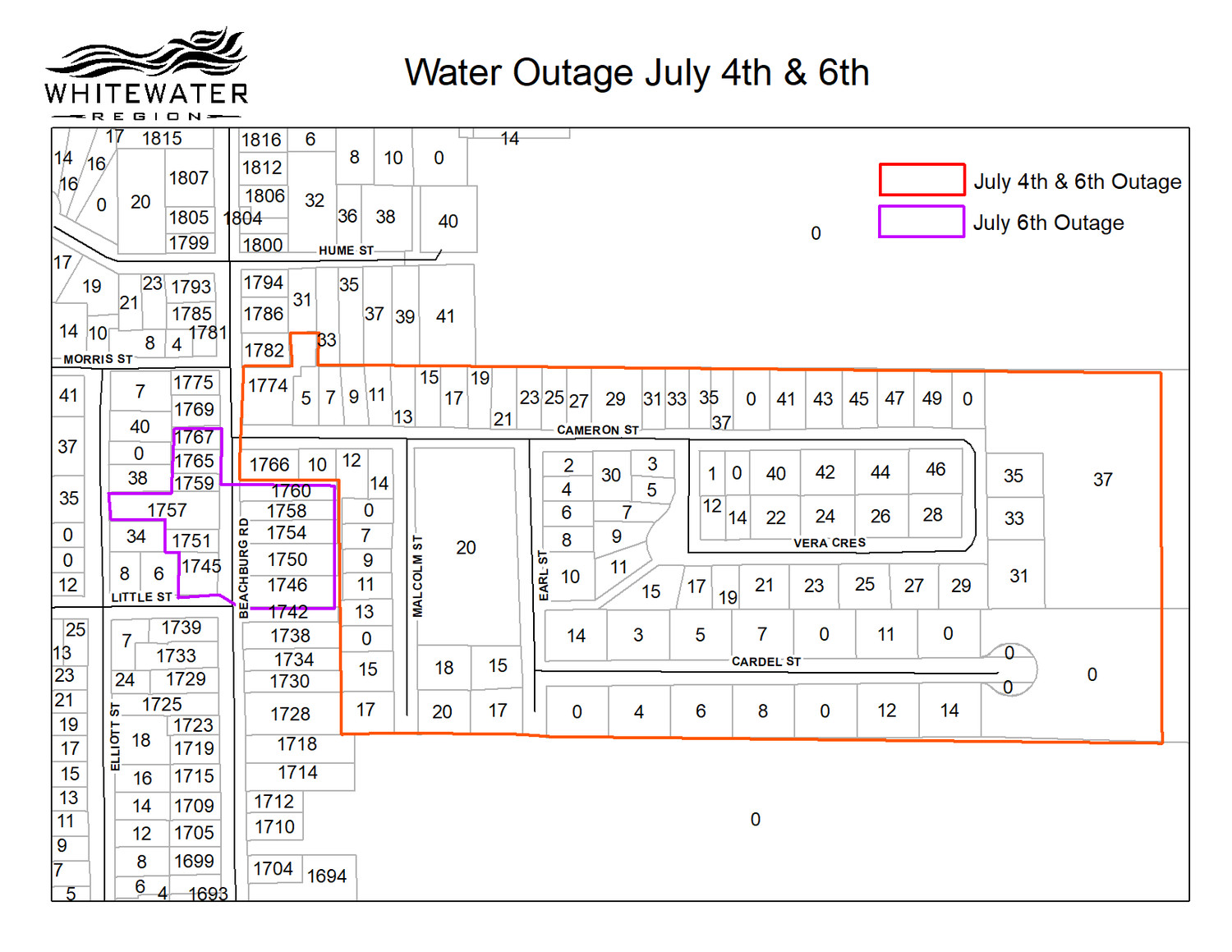 Please note that a water outage is taking place in Beachburg on July 4th and 6th for the following residents: